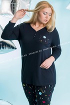 Джемпер для дома и отдыха из хлопкового футера с начесом по изнанке. Длинный рукав со спущенной линией плеча. Круглый вырез горловины. По низу изделия и рукавов притачные манжеты. По переду принт.