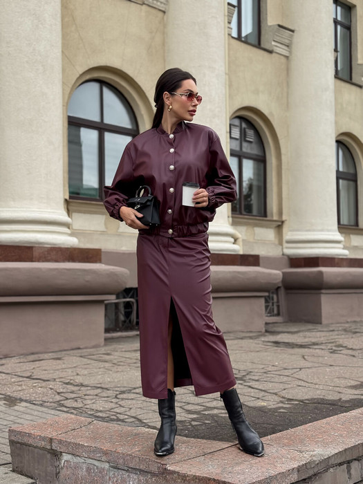 Юбка в длине  миди, выполнена из эластичной синтетичекой кожи. Застёжка - гульфик с молнией, пуговица. По центру переда обработан разрез. По задним половинам настрочены накладные карманы. По переду обработаны втачные карманы.