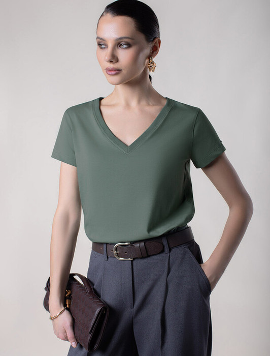 Совместные покупки Каменск-Уральский Женская одежда Футболки — Акция Vilatte Футболка из премиального хлопка с V-образным вырезом D49.109 олив