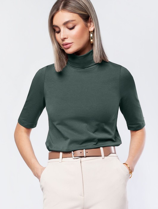 Состав: 92%Хлопок 8%ПУ Параметры модели на первом фото: Рост 172, бюст 88, талия 64, бедра 88Темно-оливковая водолазка с коротким рукавом выполнена из премиального хлопка с добавлением эластичных волокон. Гладкий трикотаж обеспечит гарантированный комфорт и удобство в использовании. На рукаве изделия металлическая нашивка с логотипом бренда. Совет стилиста: водолазку с коротким удобно сочетать с жакетом или блузкой. Также как самостоятельный верх к широким брюкам.