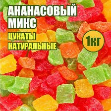 Цукаты из ананаса — кусочки мякоти плода, вываренные в сахарном сиропе и подсушенные в духовом шкафу. Они имеют насыщенный сладкий вкус и довольно мягкую консистенцию, тающую во рту. Налаживают работу пищеварительной системы, являются натуральным природным скрабом, который мягко выводит из организма вредные вещества, яды, токсины. Цукаты из ананаса природные антидепрессанты, прекрасно поднимают настроение и дарят улыбку. Оздоравливают иммунную систему, насыщают организм витаминами и минералами. Хорошо притупляют чувство голода. Срок годности 12 мес.
