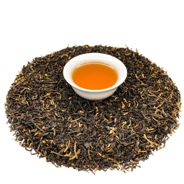 Плантационный индийский чай, листья среднего размера черного цвета с оранжевыми крупными типсами. В прогретой посуде лист благоухает легким цветочно-фруктовым ароматом.