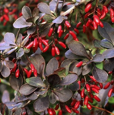 Сиреневато-розовая листва. Эффектные жёлтые цветки в кистевых соцветиях до 5 см в длину. Цветение в мае. Ягоды красные, в сентябре-октябре. Побеги красного цвета.