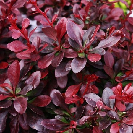 Компактный. Листья пурпурные, цветки жёлтые, крона куполообразная
