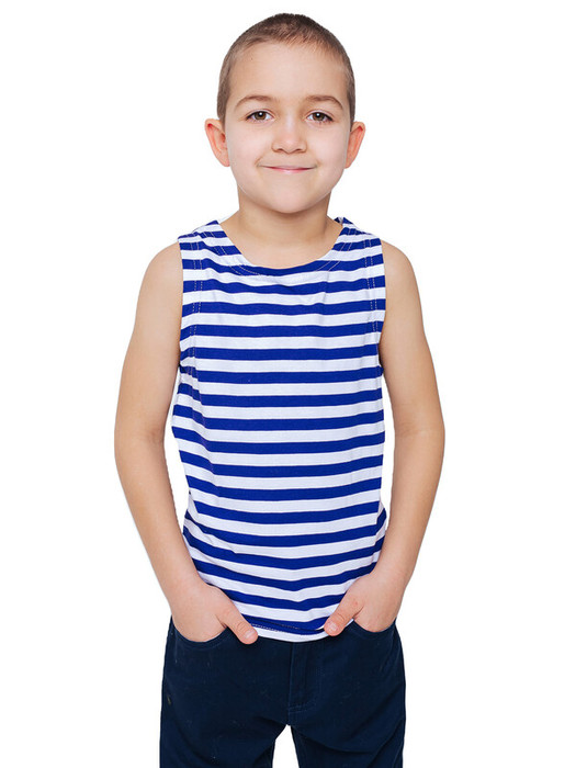 Майка тельняшка детская в синюю полоску из натурального хлопка. Майка-тельняшка прямого силуэта с круглым вырезом горловины, 100% хлопок. Можно использовать в качестве нательного белья, одежды для дома и карнавальных образов.Характеристики:Ткань: 95% хлопок, 5% лайкраПроизводитель: batik