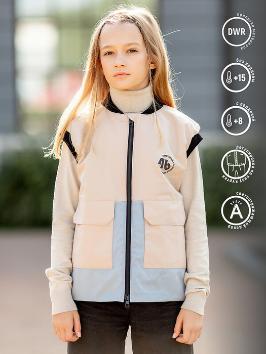 Жилет Кейси для детей серо-синий из комбинированной ткани. Детский жилет из футера и курточной ткани с разъемной молнией. Легкий и теплый жилет на весну и лето без утеплителя. Проймы и горловина из эластичного трикотажа позволяют жилету плотно прилегать к телу и сохранять тепло.   Особенности:  Сочетание двух тканей и цветов (колор-блок)Регулируемый капюшонНакладные карманы Трикотажный воротникРегулировка по низу Характеристики:Ткань верха: Футер с начесом / курточная ткань Утеплитель: без утеплителя Температурный режим от +8 (с поддевой) до +15 (без поддевы)Производитель: batik