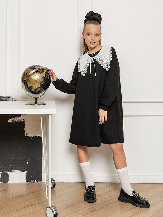 Элегантное черное платье-трапеция – универсальная база школьного гардероба. Удлиненные рукава на манжетах для аккуратного завершенного образа. Декор в романтичном стиле – съемный белый кружевной воротник на завязках (можно носить отдельно). Мягкое трикотажное полотно – приятное к телу, идеально для ежедневной носки. Классический черный цвет – легко комбинируется с любыми аксессуарами и обувью.Характеристики:Ткань: хлопок 79%, полиэстер 18%, спандекс 3%Производитель: batik