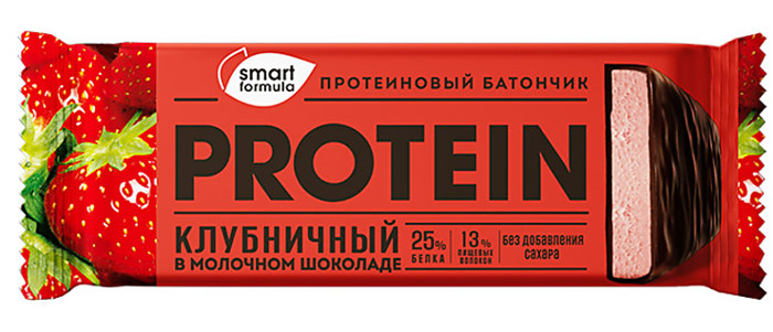 Функциональный батончик с протеиновой клубничной начинкой, покрытый нежным молочным шоколадом без добавления сахара.