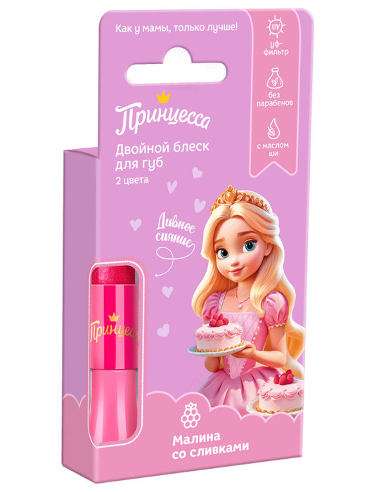 Уникальный двойной блеск для губ: меняй блеск по своему настроению. Для любителей полакомиться фруктами и сладостями. Притягательные ароматы придутся по вкусу любой юной Принцессе. Блеск имеет неяркий цвет, нежный блеск и полезный уход.