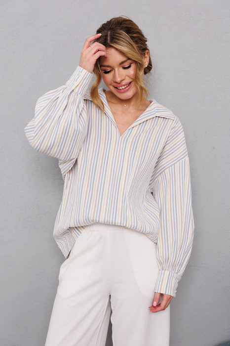 Шикарная  блузка с красивейшими рукавами на широких манжетах и вырезом на груди. Ткань имеет интересную фактурную струткуру в полосочку.