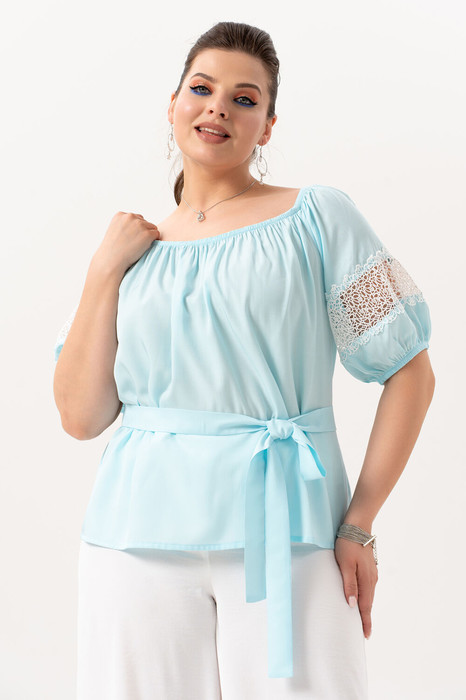 Блузка с рукавами покроя "реглан", горловина блузка с эластичной резинкой, что позволяет носить блузку на плечах и с открытыми плечами. Рукава реглан, свободные 3/4, по низу с эластичной резинкой.блузка со съёмным поясом.