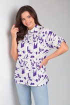 Свободный покрой, втачной рукав на манжете и патой   регулировки длины рукава, V-образный вырез и нетрадиционная его обработка контрастной и эластичной тесьмой, по переду односторонняя складка от низа горловины.