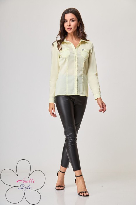 Блузка классического покроя. Полочки с нагрудными вытачками от низа, накладными карманами с закруглёнными краями. Спинка с талевыми вытачками и цельнокроеной кокеткой, переходящей на полочку. Воротник на стойке, застежка на пуговицы на цельнокроеной планке. Рукава втачные с манжетами на пуговицы, рукав регулируется патой на пуговицу. Блузка дополнена съёмной брошью на кармане.