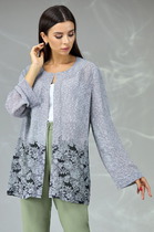 По переду выполнены нагрудные вытачки, линия плеча удлинена, что обеспечивает отличную посадку на любой фигуре, рукава свободные, укороченные, кокетливо присобраны вверху, по низу собраны на резинку.