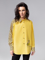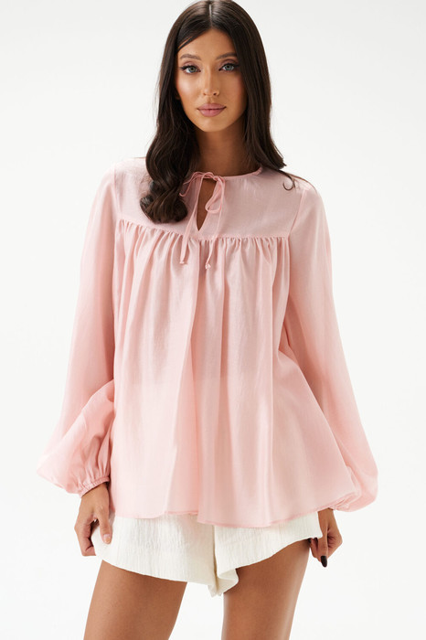 Блузка из текстильного полотна нежно- розового цвета, свободного кроя.Горловина овальная. Застежка на шнурки- завязки. Отрезная спинка со сборкой.Рукав свободный, присборен на резинку. Перед отрезной со сборкой. Длина по спинке 65 см, длина рукава 75 см