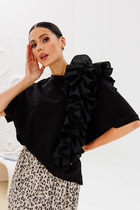 Туника женская свободного силуэта выполнена из тонкого трикотажа, крой рукава летучая мышь 3/4, воротник с драпировкой в виде шальки, длина туники по спинке 75 см.