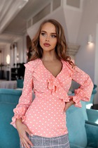 Блузка прямого силуэта, из шифоновой ткани в горох. Блузка с круглым вырезом горловины и широкой планкой на которой расположена, декоративные бусины, в блузке боковые швы переходят на деталь переда и заканчиваются разрезами, с не большим перепадом длины. Спинка на широкой обтачке. Рукава полуреглан, расширенные, низ на резинке, длина 3/4. Блузка на подкладке. С помощью блузки можно создавать интересные образы на каждый день. Длина блузки - 70 см