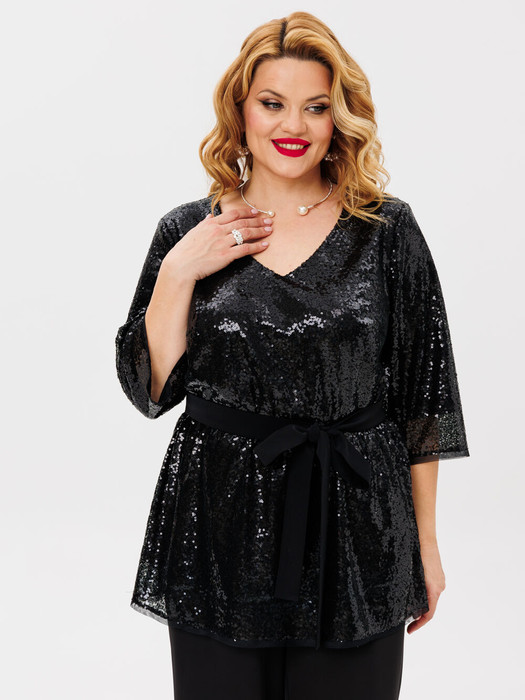 Блузка  из пайеток на подкладке.  Блузка свободного силуэта, с V-образным вырезом горловины, с нагрудными вытачками, лаконичная. Спинка лаконичная, с разрезом от горловины, с пуговицей. Рукава втрачные, длина 3/4. Для прилегания талии, в комплект входит пояс из однотонной ткани. Идеальный вариант для торжественных мероприятий, встреч с друзьями, выхода в театр.