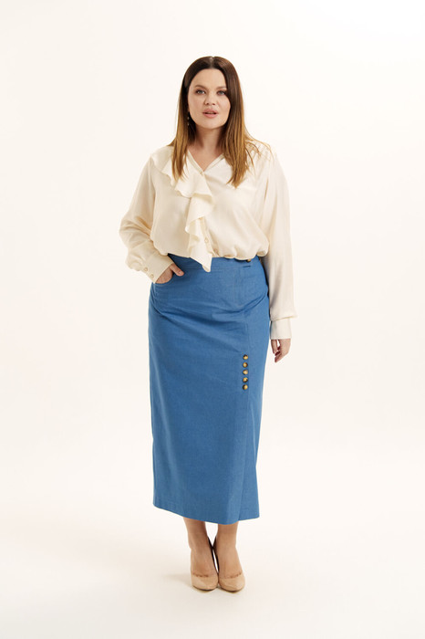 Блуза женская из легкой струящейся ткани. Горловина оформлена воланом и тонкой планкой с застежкой на петли и пуговицы. По спинке и плечам переда обработаны кокетки со сборкой. Рукав втачной, с манжетой с застежкой на петлю и пуговицу.