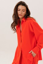 Блузка удлиненная чуть ниже бедер прямого силуэта. Воротник рубашечного типа. Рукав с манжетой на две кнопки. По боковым швам разрезы. Застежка на кнопки.