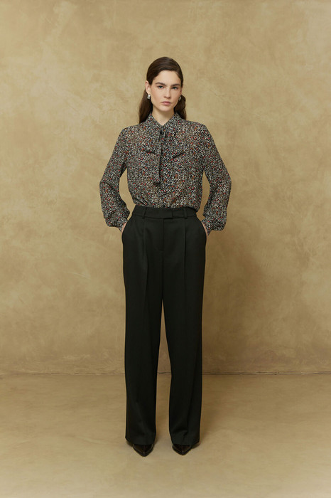 Блузка женская прямого силуэта. Воротник стояче-отложной. Застежка по планке переда на петли и пуговицы. Спинка с кокеткой, со встречной складкой. По боковым швам разрезы. Рукав втачной, с притачной манжетой, застегивающейся на петли и пуговицы. Воротник рубашечного типа. В комплекте обтачной бант.