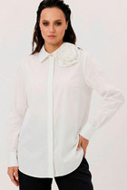 Блузка свободного силуэта из струящейся шифоновой ткани. Перед и спинка с кокеткой и сборкой. Рукав спущенный свободный с резинкой понизу. Вдоль линии кокетки и рукава вставлена рюша. Горловина V-образной формы с воротником стойкой переходящей в бант. Длина блузки - 67 см, длина рукава - 60 см.