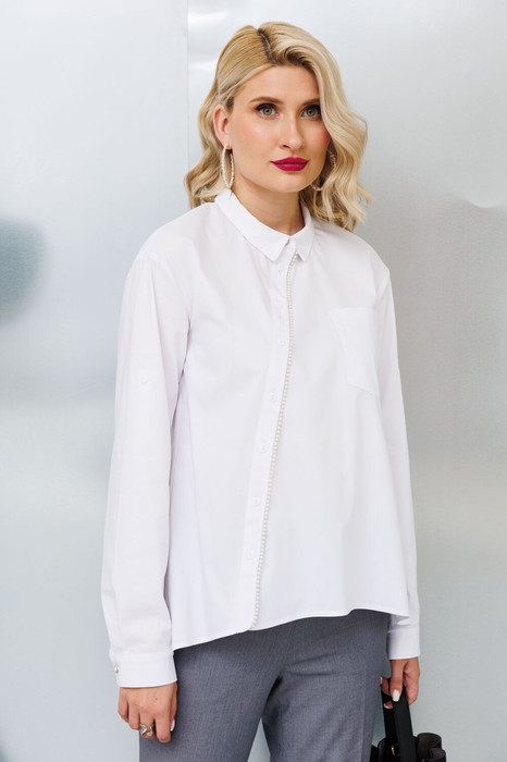 Блузка прямого кроя с асимметричной застежкой. По переду расположен накладной карман. В планку вставлена тесьма с декоративными жемчужными бусинами. Рукав длинный.