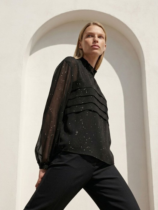 Блузка с воротником стойкой. Перед со складками на уровне груди и сборкой от горловины. Спинка с застёжкой на петлю и пуговицу от горловины. Рукава втачные с манжетами и с застёжкой на пуговицу по низу.