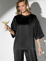 Блуза свободного силуэта. По переду планка с потайной застёжкой на семь прорезных петель и пуговиц. По спинке кокетка со сборкой. Рукава одно шовные втачные, на широкой манжете с двумя складками. Воротник отложной на стойке. Боковые швы блузы заканчиваются небольшими разрезами