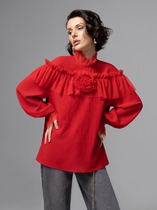 Блузка свободного кроя с цельнокроеным рукавом, воротник со стойкой. Рукав длинной ниже локтя с широкой манжетой на застежку петли - пуговицы. Спинка блузки стачная по среднему шву с обработанным разрезом на застежку пуговицу. Низ собран на эластичную ленту.