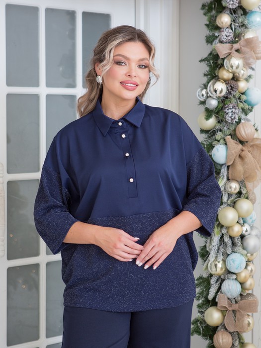 Нарядная блузка свободного силуэта, выполнена в сочетании 2-х видов ткани. Блузка с отрезным низом по переду и спинке. Верхняя часть переда с центральной застежкой на петли и пуговицы. Спинка со средним швом. Нижняя часть переда и спинки целая. По горловине втачной отложной воротник на цельнокроеной стойке. Блузка с удлиненной линией плеча и свободной заниженной проймой. Рукав втачной, длиной 3/4. Длина рукава от горловины в 50 р-ре – 53 см. в 64 р-ре – 60 см., ширина рукава по низу в 50 р-ре – 30 см. в 64 р-ре – 36 см.В В Нижняя часть блузки и рукава выполнены из трикотажного полотна с люрексом. Верхняя часть блузки из эластичной шелковистой ткани-компаньона. Блузка без подклада. Длина изделия по спинке в 50 р-ре – 68 см. в 64 р-ре – 76 см.