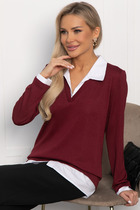 Блузка из мягкого блузочного атласа, прямого силуэта, с рубашечным воротником и застежкой на три пуговицы на планке до середины блузки. По переду блузка удлинена и низ переходит в завязку. Рукав трехчетвертной на манжете, на одну пуговицу.