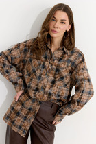 Детали: блуза приталенного силуэта, перед и спинка свободного покроя, пояс блузы со сборкой, расширенные плечи, сборки по плечам и горловине, застёжка на потайную молнию в боковом шве, воротник стойка со сборкой и застёжкой на навесные петли и пуговицы, втачные расширенные к низу рукава с резинкой по низу.