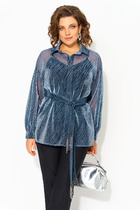 Модель прямого силуэта, со спущенным плечом. Спереди потайная застёжка на петли и пуговицы. Талия подчёркнута кулисой, в которую вставлен завязывающийся пояс. Воротник сорочечный. Блузка декорирована отделочными строчками.