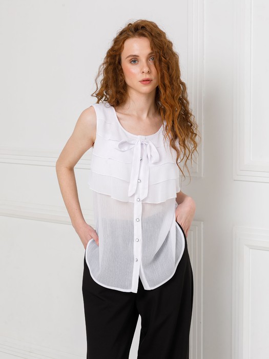 Модель прямого силуэта, без рукавов. Спинка с кокеткой, под кокеткой складка. Низ блузы закруглен. В боковых швах разрезы. Горловина, пройма и низ изделия окантованы.