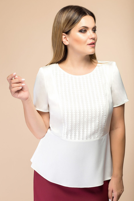 Блузка женская относится к нарядной торжественной одежде. Блузка полуприлегающего силуэта, отрезная по линии талии. Центральная часть переда из отделочной ткани, с двумя рельефами, выходящими из плечевых швов. Спинка с двумя талиевыми вытачками. горловина круглая, обтачная, без воротника. Застежка на потайную тесьму-молнию в левом боковом шве. Рукав короткий, втачной, одношовный. Блузка с плечевыми накладками. Длина спинки 60.5 см. Длина рукава 21 см