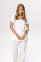 Блузка женская из текстильной ткани с цельнокроеным рукавом. Прямого силуэта. По переду блузки настрочена аппликация. По спинке расположен средний шов. Рукав 3/4, низ рукава с манжетой. Вырез горловины круглый, обработан обтачкой. Блузка застегивается на петлю-пуговицу.