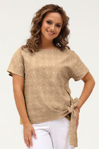 Блузка прямого силуэта с втачным рукавом. Горловина округлая с планкой по переду.  Рукав длинный,  по низу со сборкой и притачной манжетой с застежкой на петлю и пуговицу. Рукав и нижняя деталь спинки из сетки. Низ блузки асимметричный, спинка длиннее переда.   Планка по горловине, низу переда и манжеты выполнены из отделочного материала.