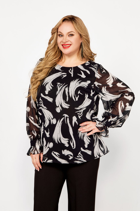 Блузка А-силуэта из нежной шифоновой ткани на подкладке из шифона. Полочка с нагрудными выточками, спинка без особенностей. Горловина круглая. Рукав втачной длинный по окату со сборкой, в нижней части собран на эластичную нить, которая внизу образует рюшу высотой 6 см.