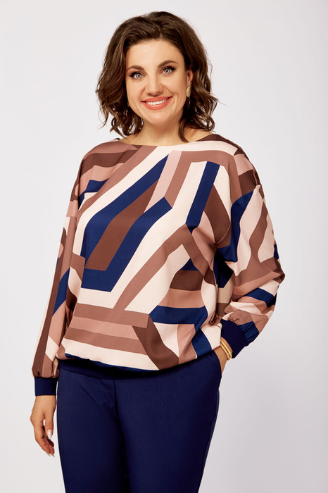 Блузка из мягкой вискозной ткани свободного силуэта со спущенной линией плеча. Горловина по полочке округлой формы, по спинке – V-образный вырез, который соединён планкой. Рукав втачной, длинный. Низ блузки и низ рукавов присобраны на декоративный трикотажный довяз.