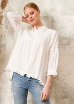 Визитная карточка этой блузки - это ее перед, украшенный двойными рюшами, а также кокетка выполненной из ажурного кружева. Именно благодаря этому отделочному элементу блузка приобретает особую элегантность и изысканность, становясь непременным атрибутом нарядного образа.
