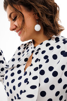 Передняя часть блузки с нагрудными выточками и центральной бортовой застежкой, выполненной на шесть петель и пуговиц.