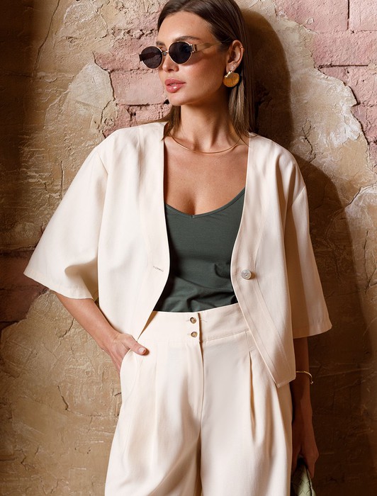 Состав: 70%Лиоцелл (Вис) 30%ПЭ Параметры модели на первом фото: Рост 172, бюст 88, талия 64, бедра 88Блузка свободного кроя в стиле кимоно выполнена из плотного лиоцелла. Модель со спущенным плечом и застежкой на одну пуговицу. Ткань изделия отлично держит форму, плавно драпируется и не просвечивает. В теплое время года приятно охлаждает кожу. Добавление синтетических волокон в составе изделия, предотвращает сминаемостьи поддерживает формоустойчивость. Блузка сочетается в костюме с брюками D24.261, D24.265, D24.267, шортами D28.057 и юбкой D24.261, а также очень эффектно с белыми шортами и джинсами.