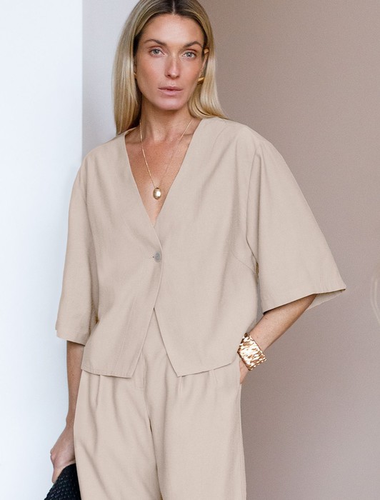 Состав: 70%Лиоцелл (Вис) 30%ПЭ Параметры модели на первом фото: Рост 172, бюст 88, талия 64, бедра 88Блузка свободного кроя в стиле кимоно выполнена из плотного лиоцелла. Модель со спущенным плечом и застежкой на одну пуговицу. Ткань изделия отлично держит форму, плавно драпируется и не просвечивает. В теплое время года приятно охлаждает кожу. Добавление синтетических волокон в составе изделия, предотвращает сминаемостьи поддерживает формоустойчивость. Блузка сочетается в костюме с брюками D24.261, D24.265, D24.267, шортами D28.057 и юбкой D24.261, а также очень эффектно с белыми шортами и джинсами.
