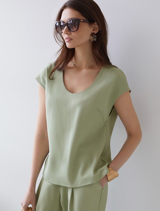Состав: 76%Лиоцелл (Вис) 24%ПЭ Плотность: 180 Г/м2Элегантная блузка светло-зеленого цвета скроенная по косой выполнена из плотного лиоцелла. Лиоцелл это более дорогой и экологичный вариант вискозы, очень прочный и шелковистый. Эта повседневная блузка с трендовым U-вырезом создана для легкого и утонченного стиля. Мягкие линии кроя создают невероятно эффектный образ, который подчеркивает естественную красоту, не стесняя движений, а свободный фасон дарит ощущение абсолютного комфорта и уверенности. Блузка красиво драпируется при движении, создавая летящий, воздушный эффект. Эта легкая блуза с коротким рукавом идеальный выбор для комфорта и стиля в теплое время года, она будет идеальна для любого повода.