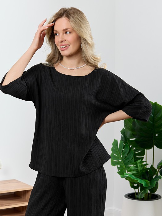 Блуза женская из гладкокрашеного тканого полотна, прямого силуэта, с горловиной овальной формы и цельнокроеными рукавами длиной до локтя. Горловина окантована основным материалом.При выборе изделия в белом цвете идеальным решением будет выбор белья нейтральных