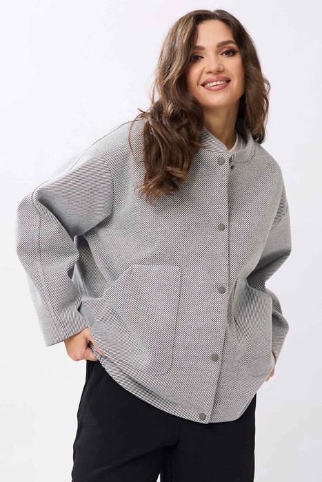Женский жакет выполнен из мягкой, пальтовой ткани что придаёт изделию универсальность и комфорт. Воротник-стойка. Застёжка: на пробивные кнопки. Рукава со спущенной проймой втачной, двухшовный. В изделии предусмотрены накладные карманы на передней части. Эластичная резинка по нижнему краю жакета создаёт лёгкую сборку, что подчёркивает силуэт и обеспечивает дополнительное удобство. Жакет на подкладке.