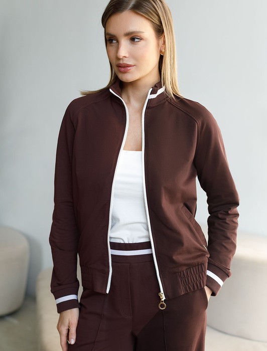 Состав: 95%Хлопок 5%ПУ Плотность: 240 Г/м2Бомбер коричневого цвета среднего объема с застежкой на молнию выполнен из премиального футера двухнитки плотностью 240 Г/м2. Натуральный состав ткани обеспечивает дышащий эффект, мягкость и приятные тактильные ощущения, Эластичный материал позволяет свободно двигаться без стеснения, а также отлично сохраняет форму даже после длительного ношения. Гладкая лицевая сторона придает бомберу опрятный и дорогой вид. Повседневный бомбер отличается аккуратным силуэтом без лишнего объема и универсальной длиной, которая идеально подходит для повседневного образа. Манжеты на рукавах и широкая резинка по низу обеспечивают надежную посадку, сохраняя тепло в прохладную летнюю погоду. Особенность бомбера - контрастные канты на горловине и манжетах, которые добавляют современный акцент и делают его более выразительным. Представленная размерная линейка позволяет подобрать оптимальный вариант для любой фигуры и размера, на маленький или плюс сайз, обеспечивая свободу движений без компромиссов по стилю. Этот легкий бомбер станет отличным дополнением к базовому или спортивному гардеробу, сочетая практичность и стиль.