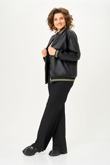 Бомбер женский из мягкой экокожи на подкладке свободного кроя со спущенной линией плеча и с центральной застёжкой на декоративную металлическую молнию. Полочка с отрезными бочками и карманами в швах. Горловина округлая со стойкой из трикотажного довяза. Рукав длинный. По низу рукава и изделия - довяз.