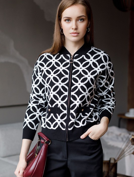 Состав: 50%Вис 20%ПА 20%ПЭ 10%Кашемир Параметры модели на первом фото: Рост 170, бюст 89, талия 63, бедра 92Бомбер жаккардовой вязки выполнен из нежной пряжи на основе вискозы с добавлением кашемира. Мягкая модель с золотистой фурнитурой не раздражает кожу, приятно ощущается на теле и поддерживает комфортный микроклимат. Совет стилиста: трендовая модель эффектно впишется в сдержанный образ, добавив образу выразительности. Сочетайте с однотонными брюками, юбкой, платьем или джинсами